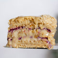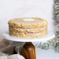 Torta Caluga y Frambuesas, deliciosa combinación de capas suaves y cremosas con dulce de leche (caluga) y un toque fresco de frambuesas naturales, que le aportan un sutil sabor frutal y un toque de acidez. Está decorada con una generosa capa de caluga en la superficie, bordeada con crocante de galleta y nueces.
